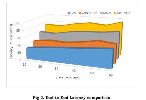 It optimizes resource allocation, space design, event scheduling, and more by leveraging MEC's low-latency capacity for processing at the network's edge and using FOA. Fig 3 shows the low-latency advantages of MEC-FOA, comparing its end-to-end latency (the total of the process, transmission, and propagation periods) to that of traditional methods such as MNN, CNN-RTIPF, and GIA. Displayed latency values for MEC-FOA show how combining FOA's optimization with MEC's edge computing can improve user experiences and operational efficiency for ice and snow sports applications by providing real-time data processing with reduced latency. Resource Utilization: Resource usage rate, throughput, and resource wastage are some measures that can quantify resource consumption. a. Resource Utilization Rate (RUR): The utilization rate is the percentage of available resources being used. It is determined by the eqn 3.