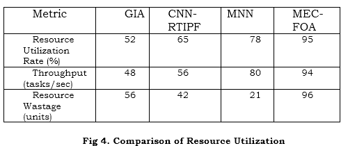 where AR is the actual resource usage and TR is the total available resources. These measures can show how well the MEC-FOA method optimizes resource allocation and usage compared to more traditional approaches. Fig 4 compares these metrics with the conventional methods to the proposed MEC-FOA method.