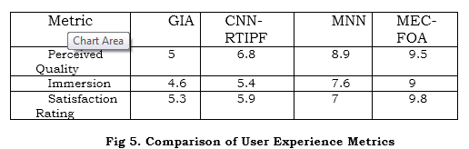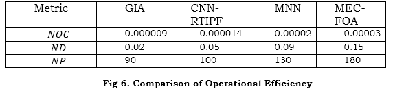 Fig 5 shows that when compared to more traditional algorithms, the MEC-FOA framework provides a better user experience for ice and snow sports. These algorithms include CNN-RTIPF, Multiclass Neural Networks (MNN), and the Group Identification Algorithm (GIA). Evaluation criteria for the proposed MEC-FOA method can include satisfaction ratings, perceived value, and immersion, all of which are indicators of how effective real-time analytics, augmented reality, and virtual reality experiences are. Presenting low-latency AR/VR, improving content distribution, and providing real-time performance data are currently the primary goals of the MEC-FOA team in their pursuit of better user experiences. Operational Efficiency: The suggested MEC-FOA method has applications in maintenance scheduling, event organization, and venue management. One way to measure the operational efficiency of the MEC-FOA system is to look at more traditional measures like operational expenditures, downtime, or productivity. This can be calculated in eqn 10.