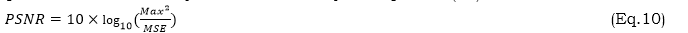 PSNR is a popular measure to evaluate the quality of decompressed or transmitted video or image frames that have been rebuilt. PSNR measures the greatest attainable signal-to-noise ratio about the disruptive noise that degrades the signal's representational accuracy. It is calculated by the equation (10).