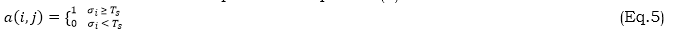 Each gray level value is compared to a threshold value (T_s) to produce the binary block (a(i,j)). When the number of gray values in a block is more than or like the threshold value, the binary block will use the values "1" and "0" for those values smaller than the threshold. This is expressed in equation (5).