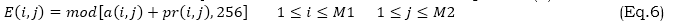 where E(i,j) is encrypted pixel density, pr(i,j) is the secret key, and a(i,j) is the compressed image value