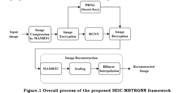 Figure 1 illustrates the proposed SEIC-MBTRGNN framework. The MAMBTC approach is employed to reduce the input grayscale pixel density. The encrypted output is obtained by adding compressed pixel values to newly generated pseudo-random numbers (PRNG). Encoders and decoders share the PRNG. Finally, RGNN is employed to manage the scalably coded data and structure it in a graph to make adaptive processing possible and increase security. At the receiving end, the PRNG decrypts the sent bit stream. Afterwards, the primary data is restored using MAMBTC and the scaling method. Combining the best features of both systems, this innovative approach to media security can produce an effective weapon. The overall process involves the following steps.