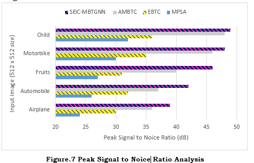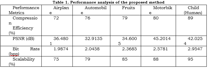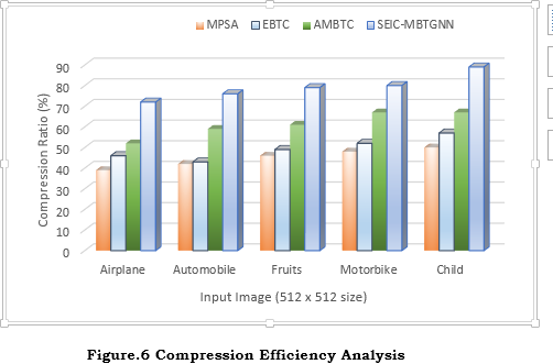 Table 1 shows the results of a comprehensive evaluation of the proposed approach (SEIC-MBTGNN) on several images, such as "Airplane," "Automobile," "Fruits," "Motorbike," and "Child (Human)." Some of the performance metrics evaluated are the Peak signal-to-noise (PSNR) ratio, Bit Rate, Scalability, and Compression Efficiency. The compression efficiency metric is used to assess how the compression algorithm works. The proposed approach achieves significant compression efficiency percentages by reducing picture size without significantly compromising quality. The Peak Signal to Noise Ratio determines the quality of the compressed images. An increase in the PSNR number results in better quality. The number of bits used to compress an image is called its bit rate. Compression efficiency is enhanced with lower bit rates. The suggested method effectively reduced data size without compromising picture quality, as bit rates decreased universally across all picture kinds. A scalable algorithm can manage photos with different sizes and resolutions. This approach may be modified in percentages from 75% (Airplane) to 95% (Child). Its high performance across different image dimensions shows the method's adaptability.