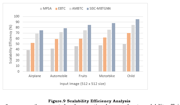Figure 9 compares the suggested and conventional approaches to scalability efficiency for different types of images. Analysis of compression efficiency over various picture sizes and resolutions reveals that system performance is workload and system-size-dependent. This proves that the suggested method is better than the current state-of-the-art in maintaining high compression efficiency regardless of the size or resolution of the image. Optimizing adaptable processing and security through integrating MAMBTC, RGNNs, and scalable coding techniques enhances performance.